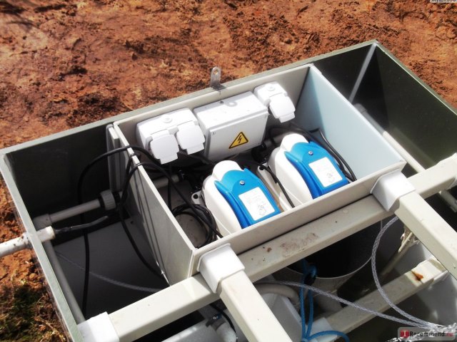 Монтаж септика. - Корпус септика имеет запас прочности и грунтозацепы, а все необходимые патрубки и электрооборудование уже установлены на своих местах. Для установки необходимо подготовить котлован достаточного размера (в соответствии с монтажной схемой в паспорте или в готовом проекте), аккуратно, избегая ударов, опустить ёмкость в котлован на выровненное уплотненное основание, проверить вертикальность установки корпуса и, постепенно заполняя станцию водой, произвести послойную, по 25-30 см, обсыпку корпуса смесью из цемента и певка в пропорции 3:1 (3 части песка и 1 часть цемента).